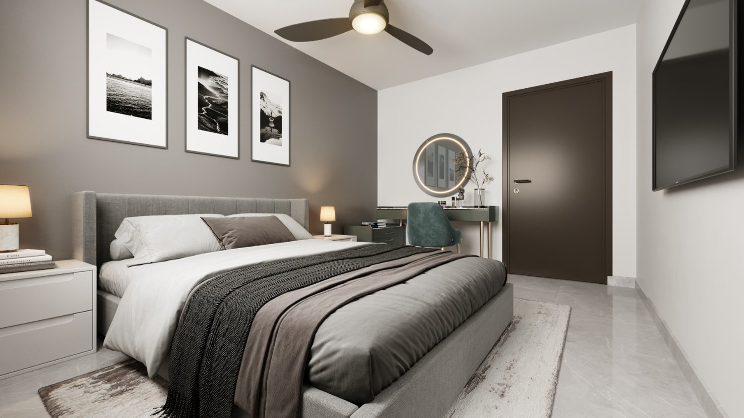Ο χώρος των δωματίων συνδυάζει με αρμονία τα χρώματα του λευκού, του γκρι και του ανοιχτού ξύλου, δημιουργώντας ένα περιβάλλον ηρεμίας και κομψότητας. Τα λευκά στοιχεία στους τοίχους και τα έπιπλα προσφέρουν φωτεινότητα και αίσθηση καθαρότητας, ενώ το γκρι, σε μαλακές αποχρώσεις και υφές, προσδίδει μία αίσθηση πολυτέλειας και ηρεμίας. Το ανοιχτό ξύλο, σε έπιπλα όπως το κρεβάτι, τα ντουλάπια ή τα ράφια, προσθέτει φυσικότητα και ζεστασιά στον χώρο.
