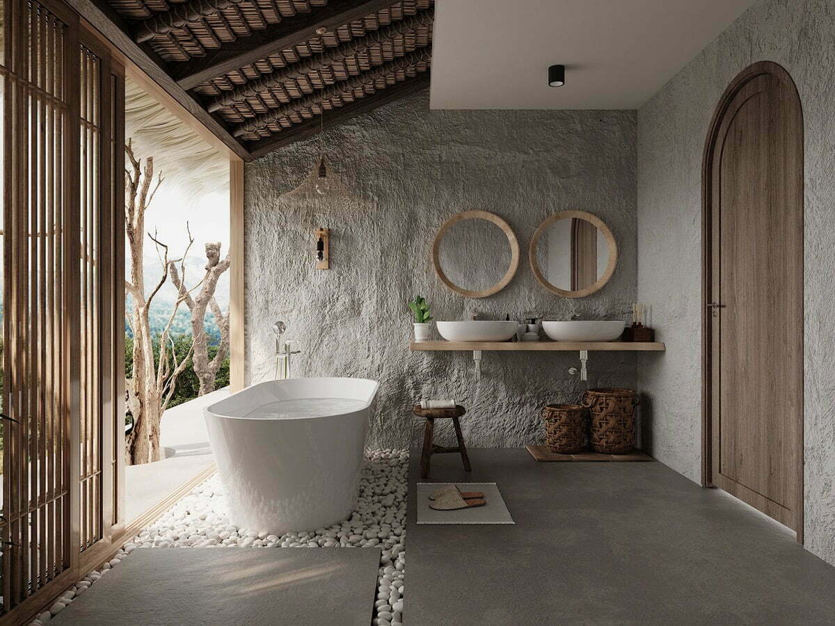 Ξύλινες ή bamboo λεπτομέρειες σε έπιπλα, καθρέφτες ή ραφάκια εισάγουν ένα φυσικό στοιχείο, κάνοντας τον χώρο πιο ζεστό και φιλόξενο. Οι απαλές, γήινες αποχρώσεις στις πετσέτες, τα χαλάκια και τα διακοσμητικά προσθέτουν αρμονία χωρίς να κουράζουν το βλέμμα.